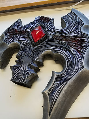 I think i painted this think about 4 or 5 times until I was happy with it. At first the whole thing was silver! I try a few different things... In the end it ended up being more purple / black. I thought it would match the costume more. I added in the dark reds and silver metals. Concept being the gem is creating the power of the Axe and morphing it. Cliche I know! 😂