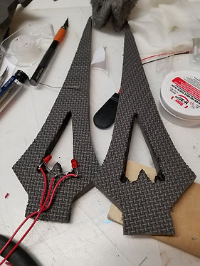 For the top pieces I cut out my pattern, traced it twice, cut out opposite sides, and added in LEDS. I needed to do all the wiring first and set in the LEDS before glueing the 2 pieces together. I left extra wire so when I was done I would have enough.